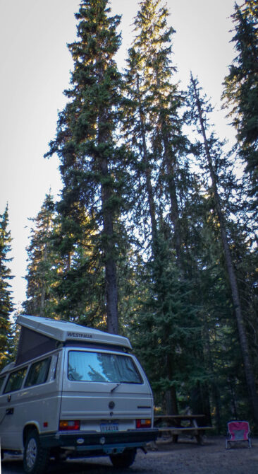 And it had taken me some resolve to decide to bring my new swim suit and take the plunge. But the blue-green algae has made it up here, at over 5,000 feet, and it is toxic. But we haven’t had an August without severe forest fires for at least four years, and everyone was happy. Amongst the mountain hemlock and Noble fir that crowd my campsite, I’m lying across Janet’s couch, and the temperature is just slightly cooler than my own skin. With no insects at all, the top is popped, windows unzipped, and her side door wide open. Bug-free perfection there. And, I’m listening to the fading rumble of maybe the third train going by up the hill from me since I got here this afternoon. The main crossing of the Cascades for freight and passenger trains going from Washington to California is just off in the forest nearby. There will be at least a couple in the night. I seem to remember the last time I was here, at Shelter Cove Resort, 31 years go, (well, 31 and a half, since it was in February) that I heard the trains and was completely freaked out. I couldn’t figure out where in the woods the earth-shaking sound was coming from. Everything looks about the same since way back then.