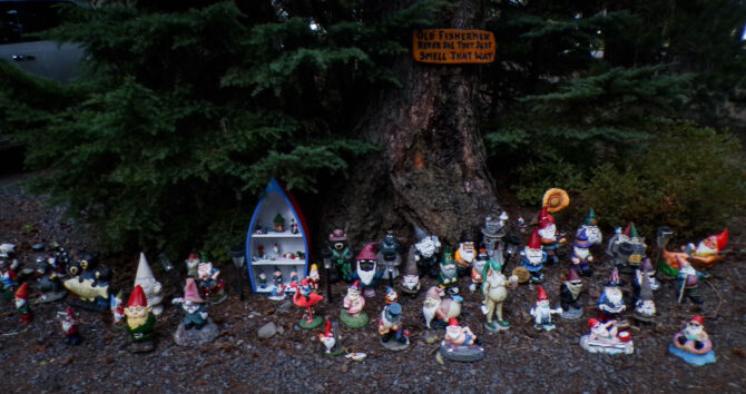 I thanked Joe for the music and Pam for the visit, and walked down to the common area to see if there was a bonfire, and passed the corner out of the camping area that has an unexplained display of gnomes that I imagine one could add to each year, if one felt so inclined.