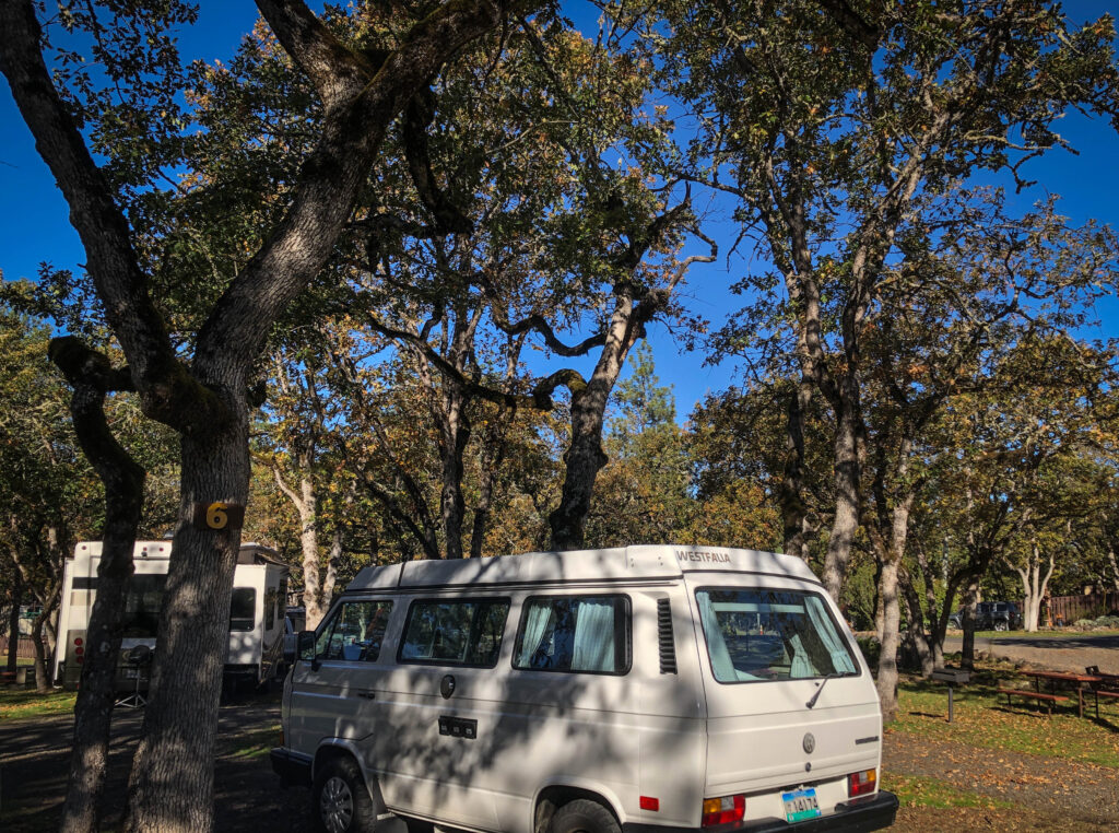 This morning, I’m here in Janet, at Medford Oaks RV Park, made in the 1940s on a knoll east of town, with white fences and graveled lanes through the ubiquitous, little black oaks. The majestic Oregon white oak is not seen down here, apparently. The man who runs the park was very friendly and chatty, and talked about the problems with theft and drugs in Medford. Apparently Oregon does not prosecute theft unless it is valued at over $1,000. Large groups of people, say 10, he said, will go in to a Walmart and grab a lot of stuff and only a couple of them will be detained, and will only get a ticket, which I imagine they ignore. He does background checks on people who want to stay longer than a couple of weeks. But apparently we were acceptable.